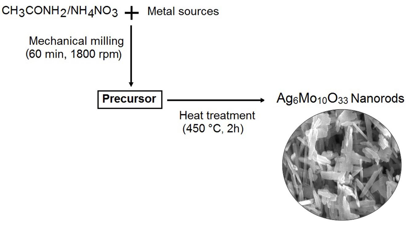 In this work, we report the synthesis of silver decamolybdate, Ag6Mo10O33, nanostructure by a simple mechanohemical process followed by calcination treatment using acetamide as driving agent. Morphological study by scanning electron microscopy (SEM) images revealed bundles of rods grown closely together with an average diameter of 92 nm for Ag6Mo10O33 sample. Ni-substituted Ag6Mo10O33 compound was prepared via introducing nickel cation to precursor system in mechanical milling step. The particle size decreased to 87 nm by incorporating nickel units in substituted polymolybdate. It was concluded that the suitable selection of reagents can direct solid phase reaction towards producing nanostructured products. This technique is easy and simple for preparation of various mixed metal oxides without using any solvents and or complex procedures. In addition, the photocatalytic activity of the prepared products was studied on the removal of 4-nitro phenol (4-NP) as organic pollutant from water. The obtained results were also discussed in detail.